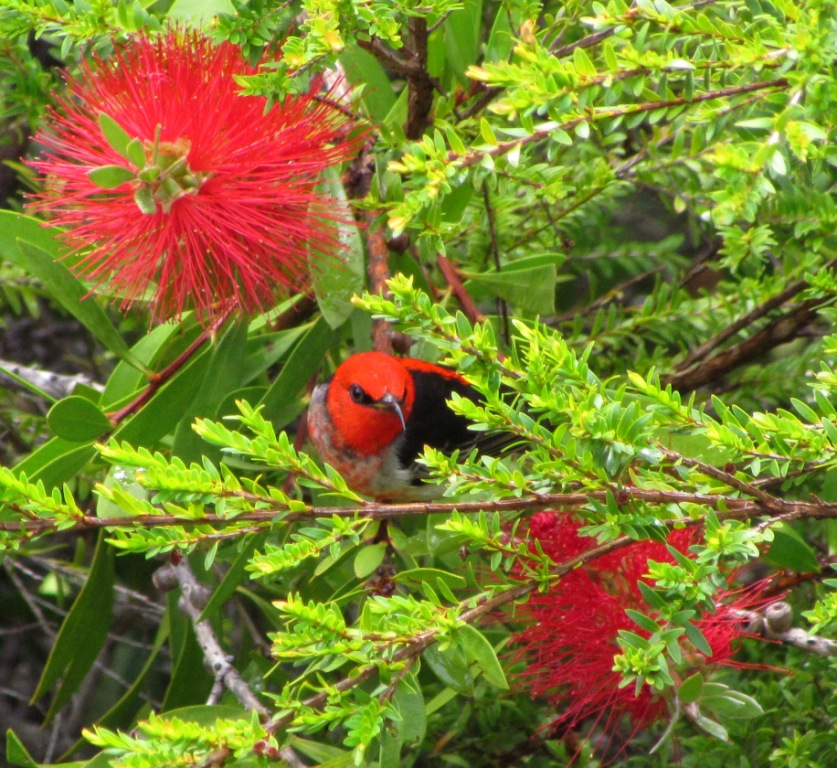 One of the most striking birds that visit our garden is the Scarlet Honeyeater, Myzomela sanguinolenta, or I should say the male bird, as the female is a olive brown with just a touch of pink under the chin. Although they are birds that generally spend their time in the tree tops feeding on the blossoms of the Eucalyptus trees, they are attracted into the garden when our bottlebrush shrubs, Callistemons are in flower, particularly during the spring when the flowering is most prolific. However at present we are having our Autumn flowering and we were pleased to have a visit from a few today. They flit quickly through the foliage so I was fortunate to get this shot of one whilst it took a break in a Banksia tree, where it had sampled the nectar from its flowers. When they are in the Callistemons they blend in very well with the flowers, as you can see in the second photo. They range is down the east coast of Australia as they follow the flowering of the Eucalyptus trees from far north Queensland to south east Victoria.
